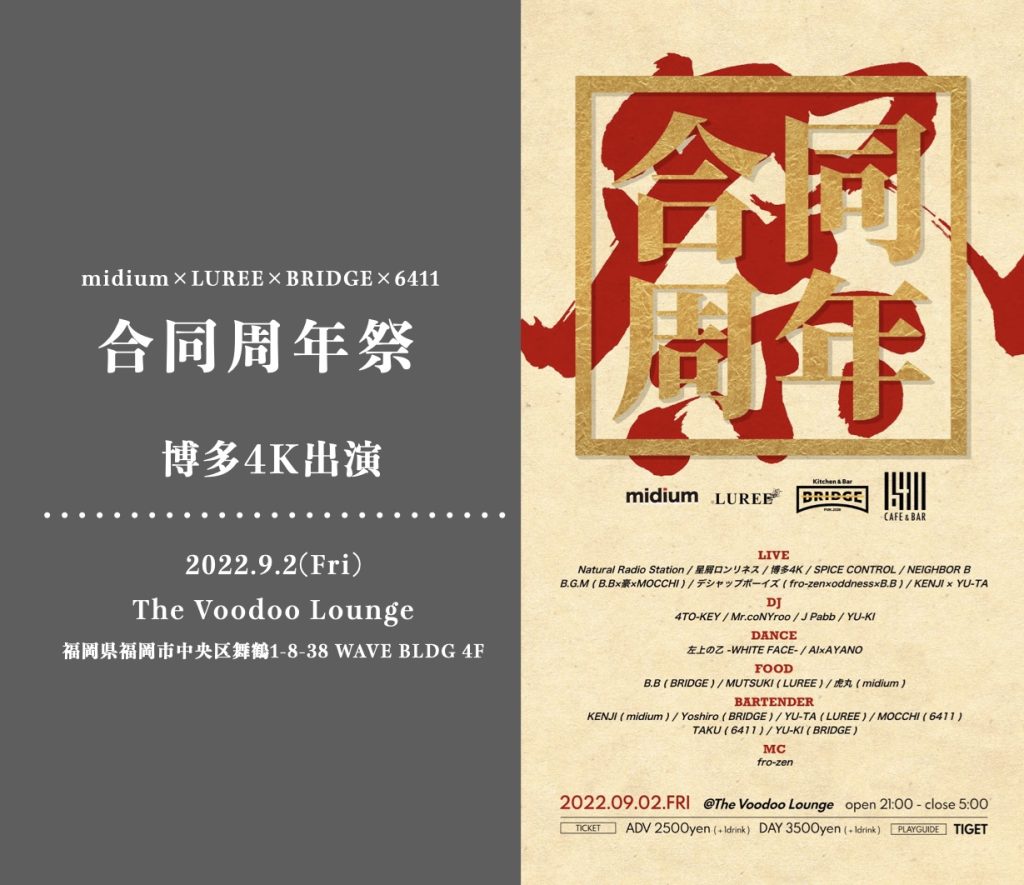 九州は福岡「The Voodoo Lounge」にて、midium×LUREE×BRIDGE×6411の4店舗合同周年... -